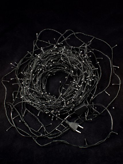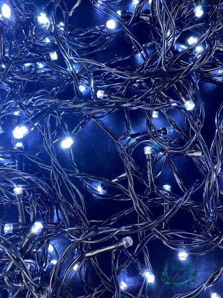 Длина гирлянды 51 метров, по все длине равномерно располагаются 510 LED лампочек среди которых имеются яркие флеш диоды которые якро вспыхивают и придают эфект мерцания. Провод черный, силиконовый.