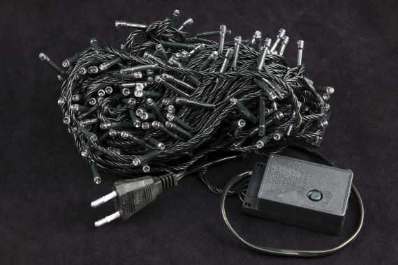Длина гирлянды 20 метров, по все длине равномерно располагаются 300 LED лампочек. Провод черный, силиконовый.